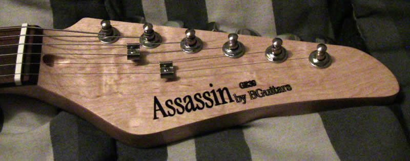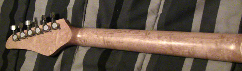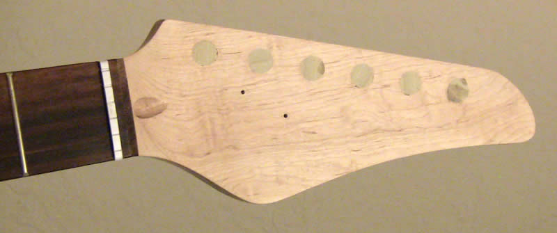 The headstock was a bit tricky. I plugged the old tuner holes and drilled new ones to accept the tuners that I took off a Peavey.