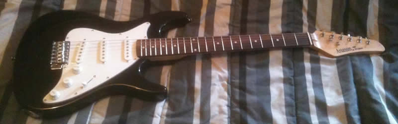 The Strat pickups work very well, there is no problem with differing string volumes and all the standard controls work. You can imagine it happily funking away in this picture.