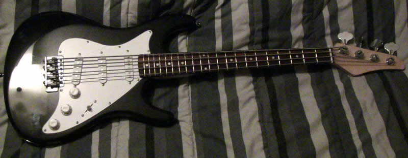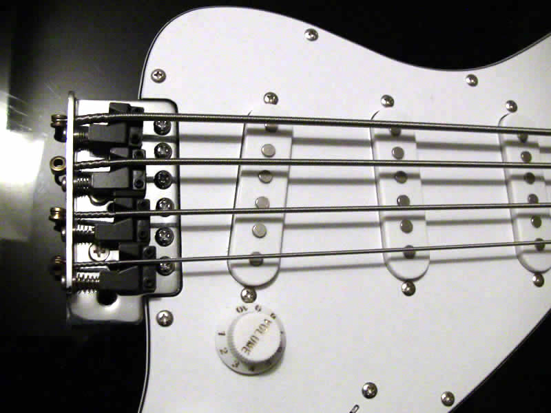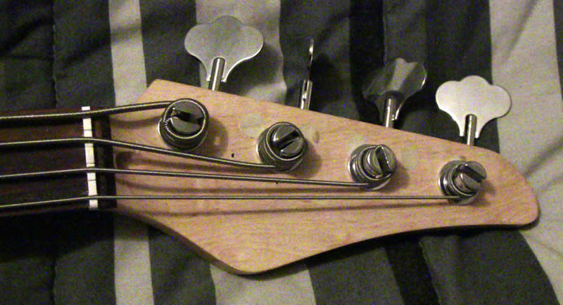 The bass tuners don't fit as close to the upper edge of the headstock as the small guitar tuners did. Placing them lower meant the strings came off the nut at a downward angle. This was just too much of an angle for the E string so I had to reverse the wrap on it which means it tunes backwards from the rest of the strings. A serious flaw and if I did this again I'd use a headstock with tuners on both sides. It works fine it's just kind of lame.