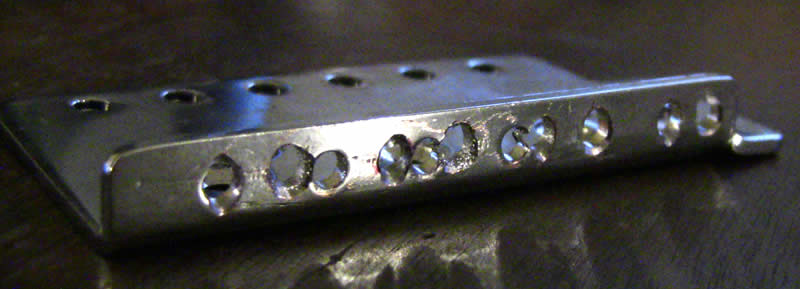 I used the saddles from an old Wilkinson bass bridge and by drilling some new holes in the old bridge, I got them to fit.