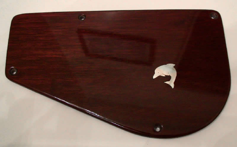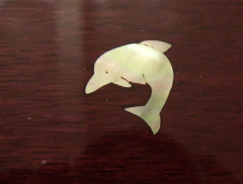 One of my earlier inlays. I got the picture of the dolphin from a can of tuna with a dolphin safe logo. A bit ironic really as thousands of dolphins were killed to make this bass.