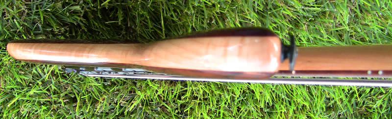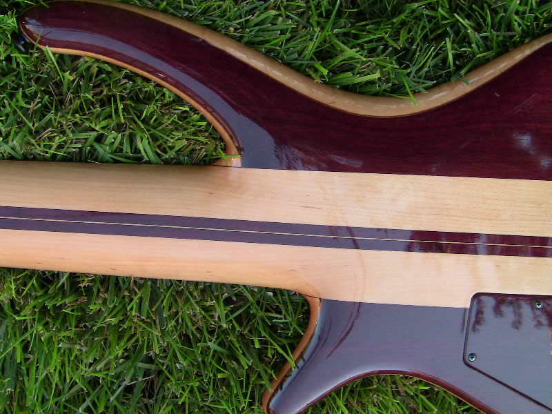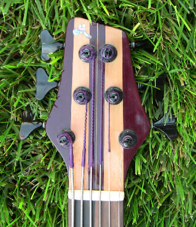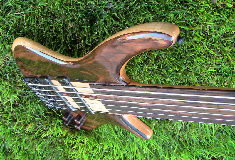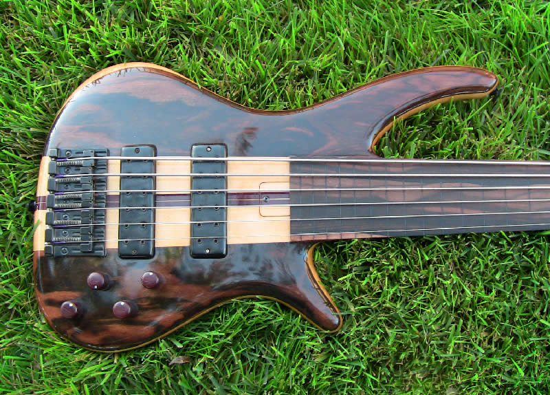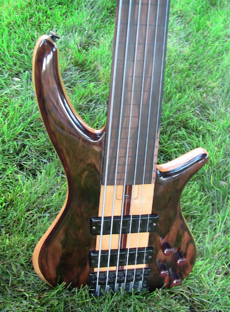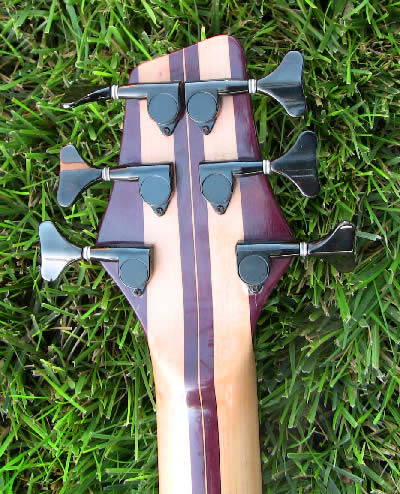 It has a maple and purpleheart neck and the body is Macassar ebony with a purpleheart back and a flamed maple core. The fingerboard is also Macassar ebony and the knobs are matching purpleheart with pearl dots.
