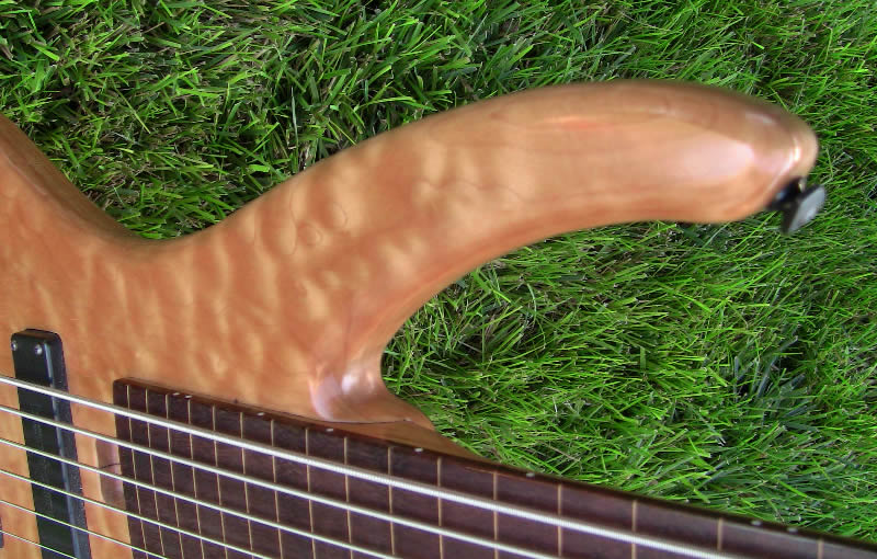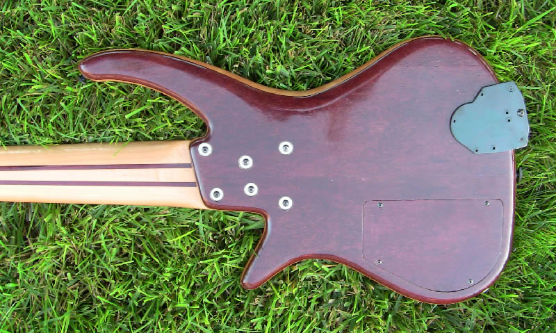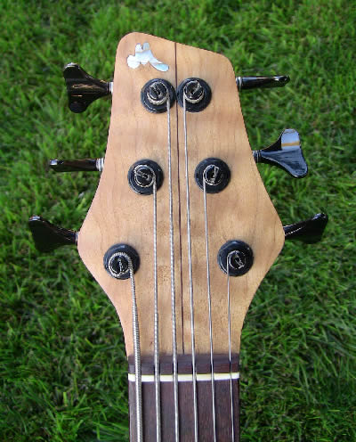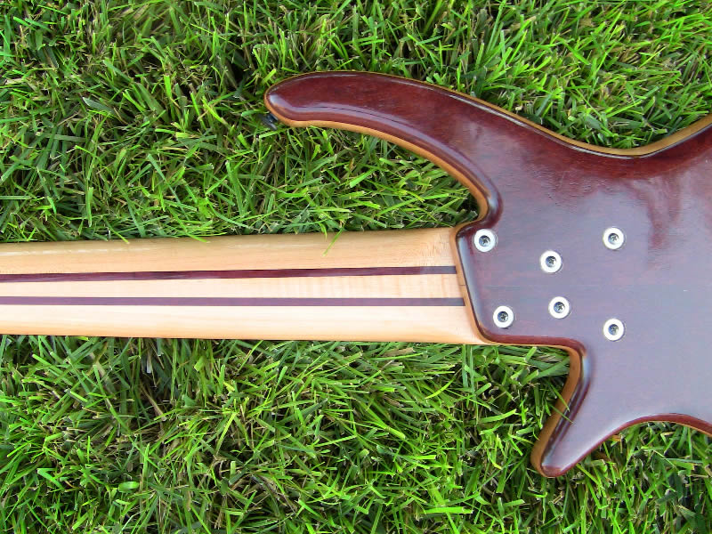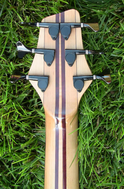 The head plate veneer was made from the same board the body came from for a perfect match. Purpleheart accent lines can be found all over this bass.